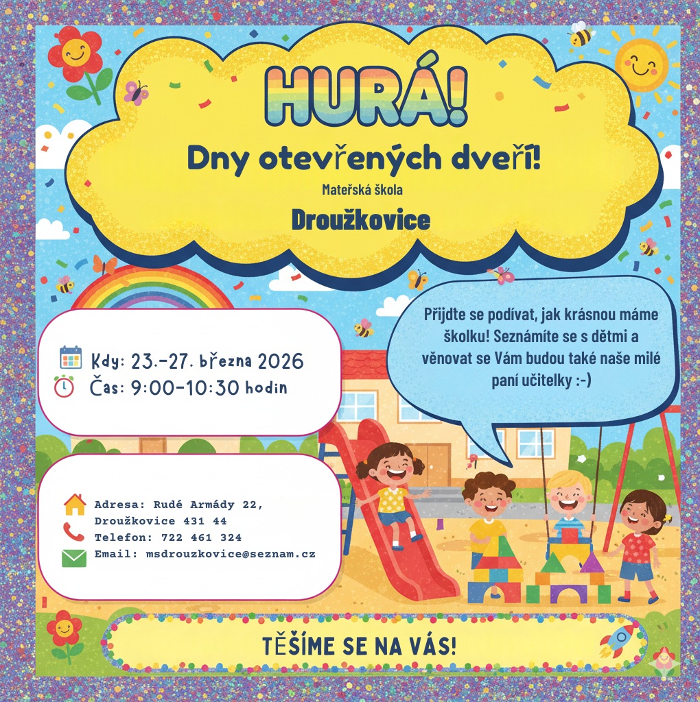 Mateřská škola v Droužkovicích pořádá dny otevřených dveří od 23. do 27. března 2026. Zveme všechny zájemce, aby se přišli podívat na prostředí naší školky. Akce se uskuteční každý den od 9:00 do 10:30 hodin. Na místě se můžete setkat s paní učitelkami a seznámit se s aktivitami, které nabízíme. Těšíme se na vaši návštěvu!